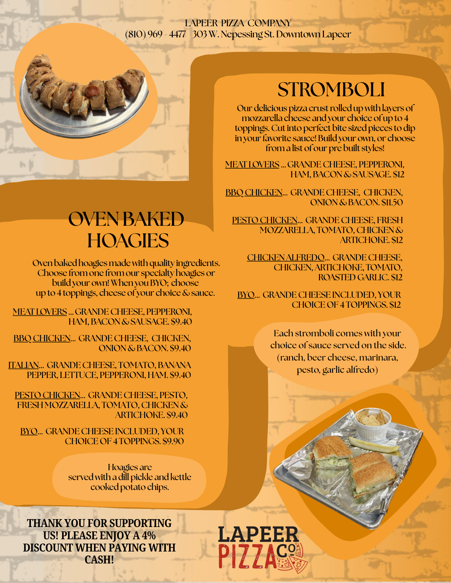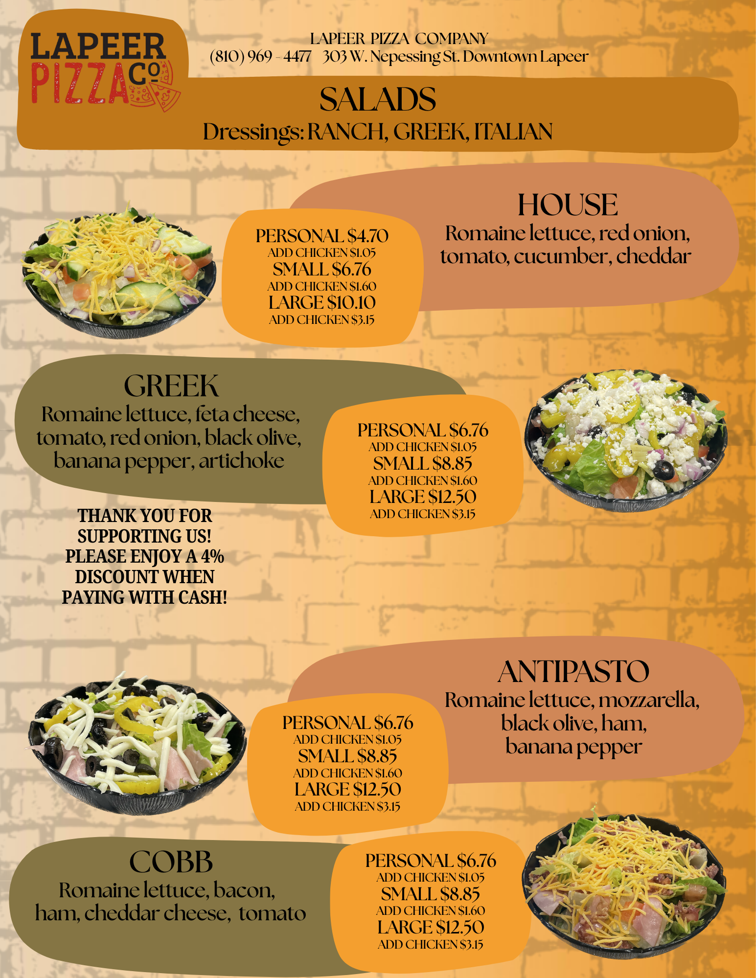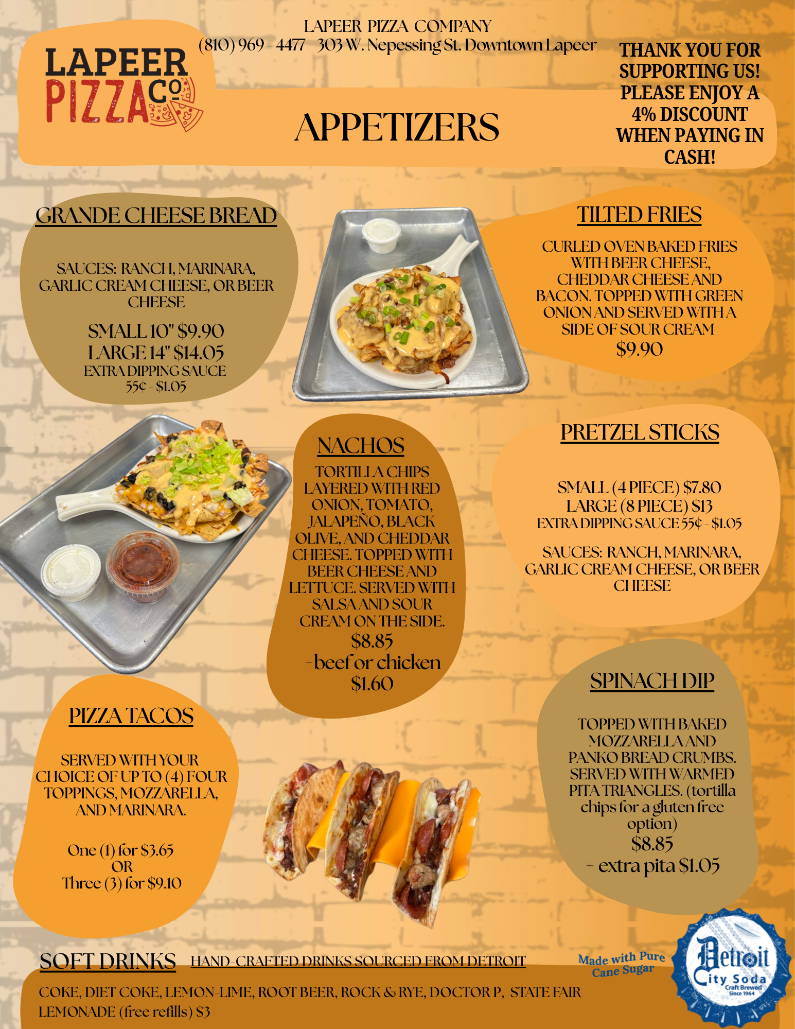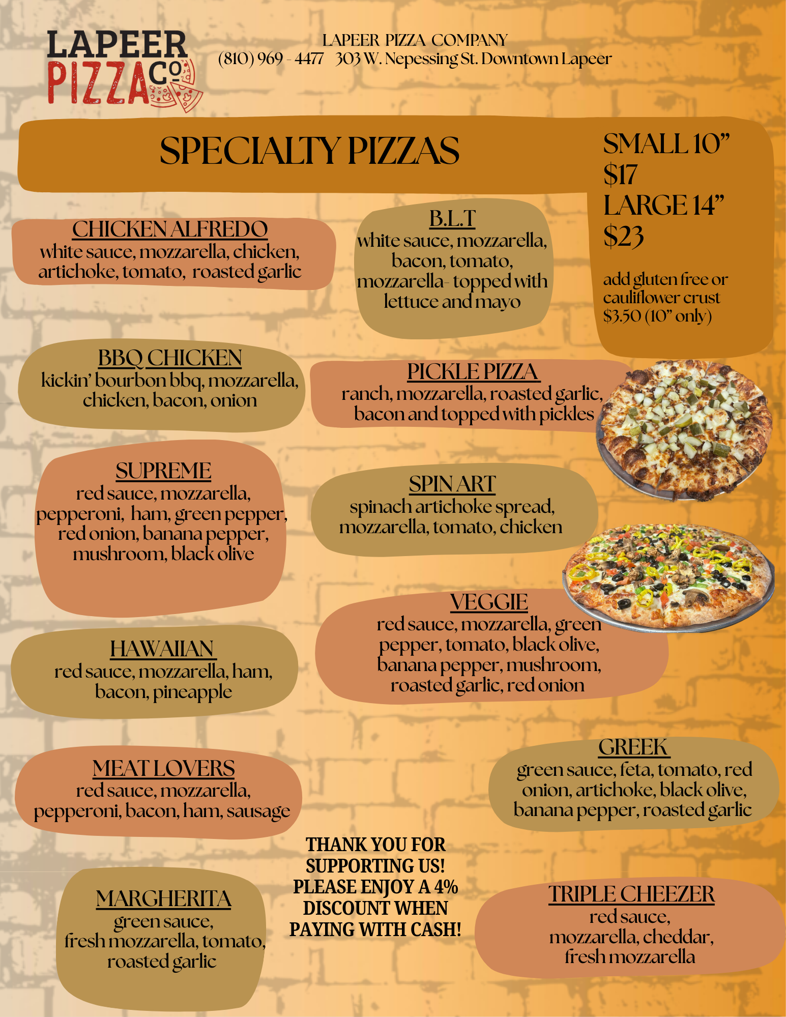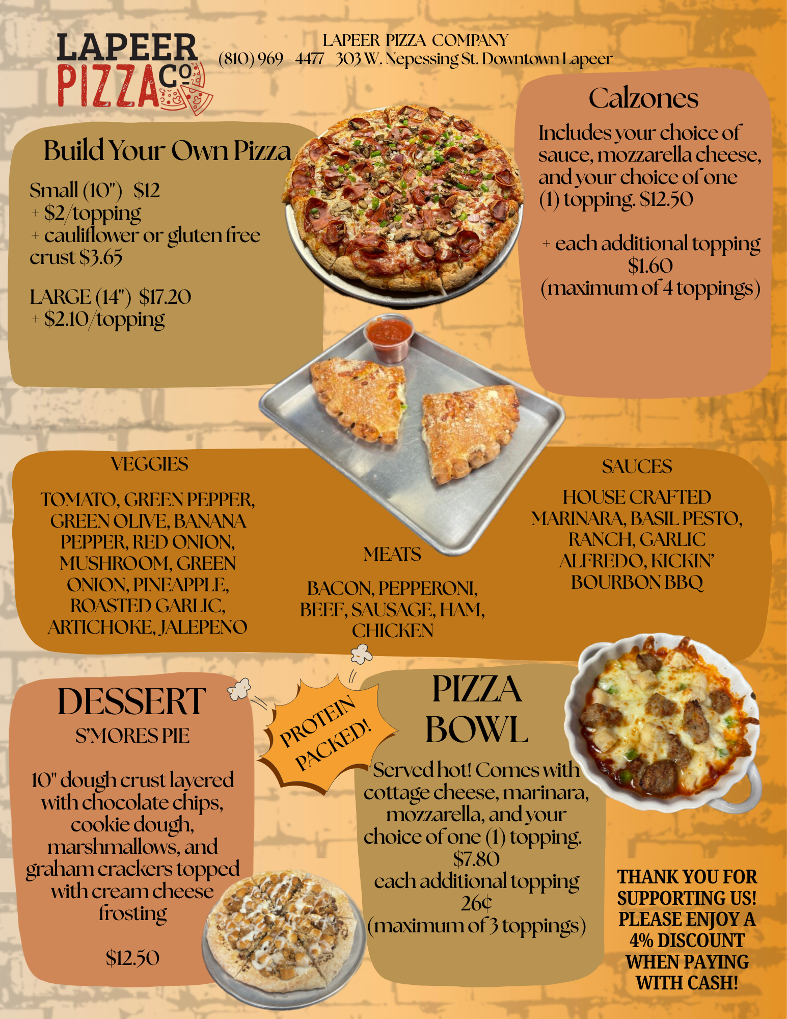 In February 2017, the Tilted Axis kitchen was converted into the Lapeer Pizza Company. We have delicious menu options including hand-tossed pizza, bright green salads, and warm desserts. We strive to use only the freshest of ingredients!